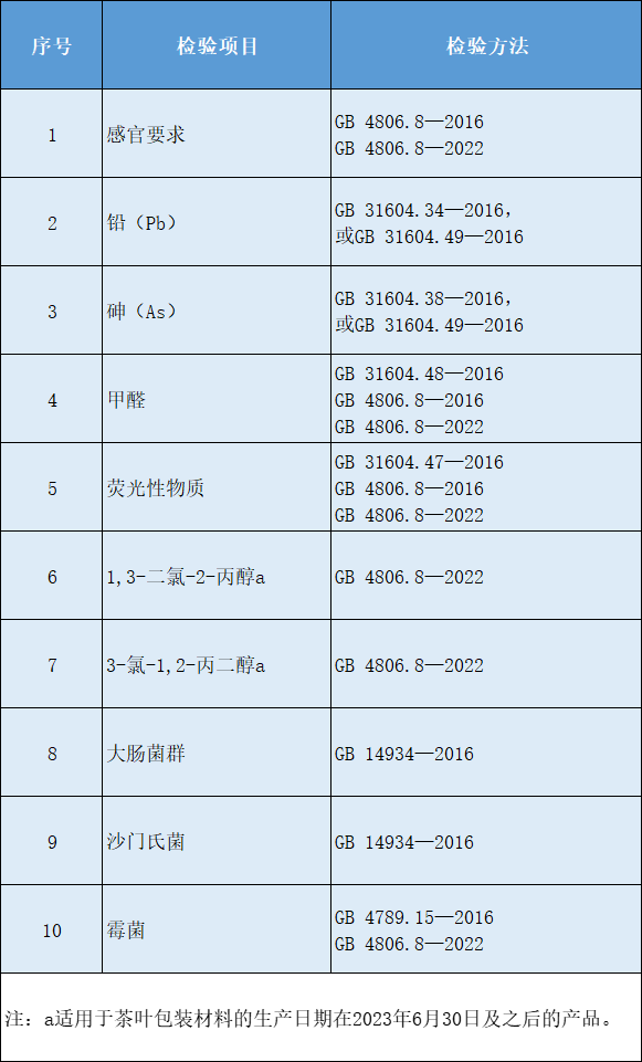 在檢驗依據(jù)方面,《細(xì)則》對不同類別的茶葉包裝產(chǎn)品提出了具體的檢驗項目和檢驗依據(jù),具體涉及GB 4806.7-2016《食品安全國家標(biāo)準(zhǔn) 食品接觸用塑料材料及制品》、GB 4806.8-2016《食品安全國家標(biāo)準(zhǔn) 食品接觸用紙和紙板材料及制品》、GB 4806.8-2022《食品安全國家標(biāo)準(zhǔn) 食品接觸用紙和紙板材料及制品》、GB 4806.9-2016《食品安全國家標(biāo)準(zhǔn) 食品接觸用金屬材料及制品》以及GB 4806.10-2016《食品安全國家標(biāo)準(zhǔn) 食品接觸用涂料及涂層》等現(xiàn)行有效的企業(yè)標(biāo)準(zhǔn)、團(tuán)體標(biāo)準(zhǔn)、地方標(biāo)準(zhǔn)及產(chǎn)品明示質(zhì)量要求的相關(guān)條目。具體內(nèi)容如下: