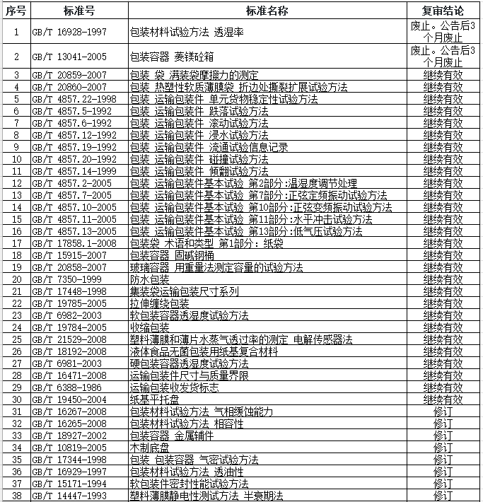 根據(jù)國家標(biāo)準(zhǔn)化管理委員會《關(guān)于開展推薦性國家標(biāo)準(zhǔn)復(fù)審工作的通知》(國標(biāo)委發(fā)[2022]10號)要求,全國包裝標(biāo)準(zhǔn)化技術(shù)委員會對列入計劃的48項國家標(biāo)準(zhǔn)完成了復(fù)審工作。